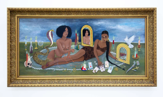 A pocos pasos de lo que es propiamente el barrio de Embajadores se encuentra La Causa Galería (calle San Pedro 6), que estos días -y hasta el 16 de diciembre- presenta la muy recomendable exposición ‘Enjundia costumbrista’, de Isabel Mirallas, artista conocida como La Ruman y de fuertes vínculos con Lavapiés (alguna de sus pinturas cuelgan de forma permanente de un lugar tan popular como Tasca Barea). Se trata de la primera muestra individual de esta creadora, quien la describe como una revisión de su universo barroco y una oda a la apoteosis de la mujer en sus contextos más oníricos. «Metáforas visuales, simbolismos y alegorías… La generosa simbología que rebosa del imaginario de La Ruman bebe de un popurrí de referencias y alusiones que rinden homenaje a la cultura castiza y celebran con vehemencia la identidad cañí«, dicen los responsables de la galería sobre esta exposición. «A las referencias autobiográficas, relacionadas con el entorno de la artista, se unen diversas influencias, como el flamenco y la copla, pero también el son cubano y otros géneros de origen latino. Estas letras, cargadas de vivencias y sentimientos ardientes, le sirven de inspiración y le ayudan a reflejar en su pintura la dramática teatralidad que encuentra en las historias que constituyen su día a día. Lejos de abrazar el minimalismo, la artista defiende la necesidad de sacrificar la realidad en favor de la fantasía, buscando representarla no en base a una ficción, ya que sus historias son siempre inspiradas en hechos reales, sino como una tergiversación de la realidad adornada de fantasía. Las obras exhiben así un realismo mágico consistente en presentar lo extraño como algo cotidiano y común, realzando la subjetividad de la experiencia compartida y aludiendo a la certeza de que, aunque una historia pueda ser cuestionada en su literalidad, la versión vivida -y contada- por su protagonista es tan real, o incluso más, que la verdadera». Citando a Virginia Woolf, y su aclamada obra “Una habitación propia”, La Ruman explica sus inspiraciones, según recoge La Causa Galería: “Durante millones de años las mujeres han estado sentadas en casa, y ahora las paredes mismas se hallan impregnadas de esta fuerza creadora. […] Esa es la razón que explica por qué las mujeres tienen interiorizada la memoria silenciosa de las habitaciones que han marcado el ritmo de las diferentes edades de sus vidas, el paso del tiempo por ellas.”