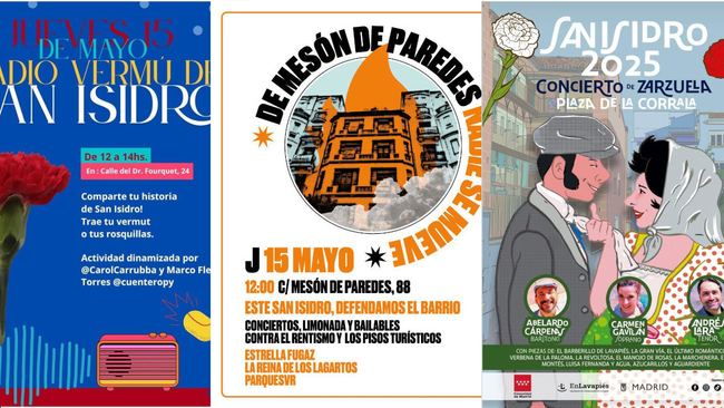 La celebración de San Isidro en Lavapiés llega con propuestas de muy distinta índole. Lo único malo es que todas ellas coinciden en el tiempo, por lo que toca elegir. A las 12 de la mañana los vecinos del número 88 de la calle Mesón de Paredes convocan al barrio a una jornada de «música, sorpresas y lucha vecinal» en la que expondrán la difícil situación por la que atraviesan, con su casero pidiendo que se vayan del edificio para así poderlo alquilar como apartamentos turísticos o de media estancia. Tras leer un manifiesto, celebrarán con música su decisión de desobedecer y de permanecer en sus viviendas, al tiempo que luchan por que les renueven sus contratos de alquiler. Habrá actuaciones de Estrella Fugaz, La Reina de los Lagartos y Parquesvr, además de reparto de limonada. También desde el mediodía y hasta las 14 horas en Esta es una plaza se celebrará un radio-vermú «colectivo y autogestionado», en el que los asistentes están llamados a compartir vermú y rosquillas con sus vecinos y a contar las respectivas historias de San Isidro que hayan podido vivir. Por último, en la plaza de La Corrala, desde las 12:30 horas, se podrá disfrutar de una recopilación de piezas emblemáticas de zarzuela de temática madrileña y lavapiesera. Las interpretaciones correrán por cuenta de la soprano Carmen Gavilán, el tenor Andrés Lara y el barítono Abelardo Cárdenas. El concierto está organizado por la asociación de comerciantes de Lavapiés e incluido dentro del programa municipal de San Isidro.