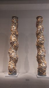 De lo primero que ven todas las personas que se acercan a visitar la muy recomendable y reciente Galería de las Colecciones Reales, junto al Palacio Real, son 4 descomunales columnas churriguerescas de madera, de 6 metros de altura y 600 kilos de peso.