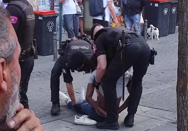 Momento en el que dos agentes levantan al detenido que había perdido la consciencia en Nelson Mandela | Foto: XLAVAPIÉS.COM Aunque las sirenas de policía son habituales en las calles de Lavapiés, en torno a las 21 horas de este miércoles la coincidencia de dos sucesos distintos en las plazas de Tirso de Molina y de Nelson Mandela hizo que sonaran con más furia que de costumbre y que el barrio quedara inundado de coches, furgones y agentes de policía en cuestión de minutos. En Tirso, una pelea en la zona del área infantil acabó con dos personas detenidas y otra trasladada al hospital con una fuerte herida abierta en la cabeza. Por otra parte, en Nelson Mandela, lo que comenzó con un simple registro policial a unos jóvenes junto a la fuente de Cabestreros -a los que no se les encontró nada extraño encima- y siguió con una mediación en una riña se complicó hasta el punto de derivar en una actuación en la que participaron alrededor de medio centenar de agentes y que terminó con cuatro detenidos, según testigos presenciales. Entre estos detenidos, inquieta el estado de salud de un guineano que quedó tendido inconsciente en la calzada cuando agentes de la policía municipal lo obligaron a que se echara al suelo para, seguidamente, esposarlo e inmovilizarlo mediante una técnica que le hizo perder la consciencia. El joven había sido arrestado por haber estado grabando con su móvil la actuación policial que se desarrollaba en la plaza y se lo llevaban a comisaría para identificarlo, sin que opusiera resistencia, cuando incomprensiblemente acabó con sus huesos en tierra y sin conocimiento. Toda la escena ha quedado registrada en diferentes vídeos que este periódico ha podido ver con detalle. Un par de agentes acababan de haber estado hablando tranquilamente varios minutos con el hombre antes de emplear la violencia contra él. Al ver que el arrestado no se movía los policías que se encontraban sobre esta persona se levantaron dejando el cuerpo en el suelo. Durante un rato largo su rostro permaneció besando los adoquines de la calzada. Mientras, los ánimos se caldeaban en la plaza y los testigos de los hechos pedían asistencia médica para el detenido e increpaban a los agentes que, finalmente y sin esperar a una ambulancia, lo introdujeron en volandas en un coche patrulla. Antes de esta detención fueron arrestadas otras tres personas en Nelson Mandela: un senegalés, otro guineano y un español. Testigos captaron con sus móviles dos de esas detenciones. En las imágenes se puede ver que los agentes actuaron con contundencia en la detención del senegalés, un conocido en la plaza que, según distintos vecinos, tiene problemas mentales. Los otros dos arrestos también fueron por estar grabando la actuación policial, aunque en el caso del español detenido la versión de la policía difiere y, al parecer, se le acusa de intentar lanzarle piedras. Esta mañana Policía Nacional ha aclarado que "todos los detenidos llegaron bien a comisaría", despejando así las dudas que sobre el estado de salud del senegalés detenido se habían generado. Sobre lo sucedido, fuentes policiales aseguran que cuatro policías municipales y uno nacional resultaron heridos y que todo se desencadenó cuando unos agentes que estaban realizando "labores propias de su trabajo" fueron increpados y agredidos. Anoche, de Nelson Mandela a la policía se la despidió entre pitos, denuncias de abuso y gritos de "¡Asesinos, asesinos!".