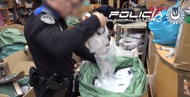 Momento de la intervención policial | POLICÍA MUNICIPAL DE MADRID La Policía Municipal ha detenido a dos personas por un presunto delito contra la propiedad industrial y se ha incautado de 8.559 prendas falsificadas en un local situado en el número 51 de la calle Mesón de Paredes. Según informaban este lunes fuentes policiales, la operación se produjo el pasado 3 de enero sobre las 16:30 horas y se inició de forma casual, cuando unos agentes que patrullaban la zona vieron, a través de los cristales del establecimiento, cómo una persona estaba repartiendo bolsas de gran tamaño a un grupo de hombres. La intervención tuvo lugar el día 3 sobre las 16:30 horas. Después de entrar en el local, los agentes descubrieron que detrás del mostrador del establecimiento había un sótano oculto en el que se guardaban bolsas con distintas prendas textiles de marca, la mayoría camisetas de fútbol, listas para su distribución y venta, con un etiquetado que no se correspondía con el de los productos originales. Según apunta Europa Press, estando los policías en el comercio llegó también una persona con falsos logos de marcas de bolsos. Los agentes detuvieron a una persona de 43 años y a otra de 61, ambas acusadas de un delito contra la propiedad industrial.