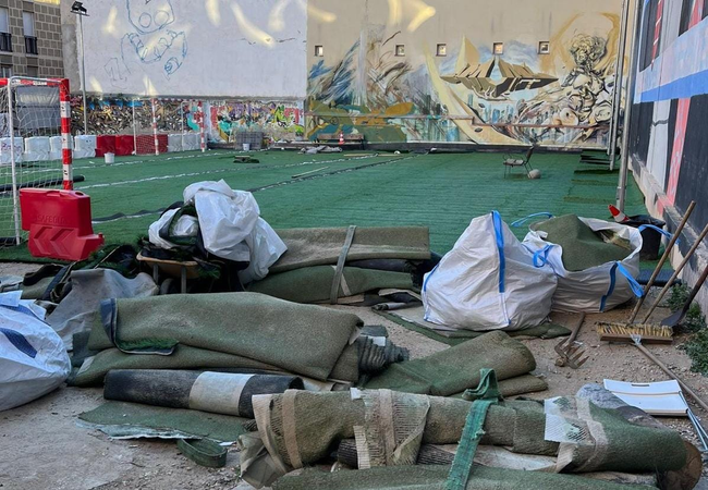 Arreglo provisional del césped artificial de la pista de Embajadores 18 | Foto: xLAVAPIÉS El deteriorado firme de la pista deportiva del solar municipal de Embajadores 18 está siendo renovado gracias a la generosidad de Opsa, empresa dedicada a la colocación de césped artificial que, a petición de los responsables del club Dragones de Lavapiés, ha accedido a arreglar, totalmente gratis, el pequeño campo que no sólo se había convertido en un espacio no apto para la práctica del fútbol sino que, incluso, resultaba peligroso para la integridad física de las decenas de personas, niños y niñas en su mayoría, que seguían disfrutando en él de su deporte favorito. Los trabajos para adecentar esta pista comenzaron el lunes y durarán 3 días, por lo que la renovada instalación estará lista para el fin de semana, cuando, entre otras cosas, se disputará en él el torneo con equipos femeninos que han organizado desde Dragones con motivo de la celebración del 8M, Día Internacional de la Mujer. Renovación del césped artificial de Embajadores 18 | Foto: xLAVAPIÉS INTERVENCIÓN INAPLAZABLE OPSA