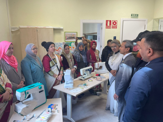 Acto de inauguración del proyecto | imagen: VALIENTE BANGLA La asociación Valiente Bangla ha puesto en marcha Yahaal Muri 2: Mujeres que tejen y transforman, proyecto financiado por la Unión Europea a través de Intermón Oxfam que destinará 14.922 euros, a lo largo del presente año, para la creación de espacios y recursos para la integración de mujeres de origen bangladesí que habitan en Madrid y, muy especialmente, en la zona de Lavapiés, donde su número es mayor. Hacia esa integración a la que aspira este proyecto se caminará «mediante el desarrollo comunitario y el empoderamiento», materializándose a través de «recursos tales como clases de español, talleres de costura y de iniciación al trabajo, ayuda materno-infantil, intérpretes y cuidadoras, etc», apuntan fuentes de Valiente Bangla, asociación nacida en 2007 que tiene como meta «conseguir la integración y la convivencia de los diferentes colectivos en riesgo de exclusión que existen en la Comunidad de Madrid, eliminando sus desigualdades y mejorando su estado de bienestar» y que trabaja, especialmente, con la comunidad de Bangladesh instalada en la capital. Son esas mismas fuentes las que calculan que del programa Yahaal Muri 2 se beneficiarán directamente alrededor de 400 mujeres bangladesíes durante el presente año, algunas de las cuales ya están pudiendo disfrutar del apoyo del programa y de alguno de los cursos que han comenzado y que se imparten en espacios situados en Lavapiés-Embajadores como son el centro comunitario Casino de la Reina, el Espacio de Encuentro Feminista (Espacio Anette Cabelli, según su nombre oficial, de Ribera de Curtidores) y el propio local de Valiente Bangla en la calle Provisiones. En palabras del presidente de la citada asociación, Mohammed Elahi, Yahaal Muri 2 contribuirá a «eliminar situaciones de vulnerabilidad e impulsará la participación e inclusión de la mujeres en la vida social, cultural y económica madrileña», en busca de «hacer a las mujeres autónomas e independientes». Cabe recordar que hace dos años, también de la mano de Intermón Oxfam, hubo un primer Yahaal Muri que se dedicó por completo a la lucha en contra de la violencia de género dentro del mismo colectivo con el que ahora se sigue trabajando en lo que sería una segunda parte de aquel programa. Según datos de Valiente Bangla, «en Madrid viven unos 15.000 bangladesíes, unos 6.000 se encuentran en situación regular y el resto en situación irregular». De esas 15.000 personas, casi la mitad habitan en el distrito Centro.