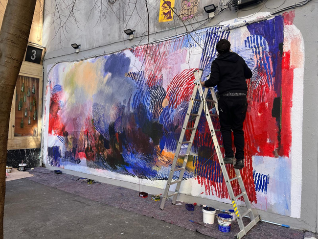 Emilio Cerezo, ultimando su mural en la calle San Millán | XLAVAPIÉS.COM La pared del número 3 de la calle de San Millán, junto a La Bobia, vuelve a cambiar de aspecto. Tras exhibir durante los últimos meses el mural ‘Desahucio’, de la artista gallega Lidia Cao, es una obra del murciano Emilio Cerezo la próxima inquilina de este espacio y la intervención número 30 del proyecto #mindthewall. #mindthewall fue puesto en marcha hace una década por Swinton Gallery (Miguel Servert, 21), galería nacida con el objetivo de «mostrar el talento de artistas nacionales e internacionales con una base de influencia en el arte urbano y el arte más independiente». Consolidado en el barrio de Embajadores, bajo este proyecto se realizan en torno a tres intervenciones artísticas al año en el mismo muro. Desde octubre de 2022 al comisariado de Swinton se le sumó el de Madrid Street Art Project, entidad fuertemente vinculada con Lavapiés y dedicada a organizar, producir y difundir actividades relacionadas con el arte urbano. Los artistas que intervienen la pared de San Millán son invitados por los comisarios a participar en el proyecto. Los últimos en pasar por ella, en 2023, han sido 108 y la ya citada Lidia Cao. Desde hace tres jornadas, Cerezo trabaja sobre este muro en una obra que está ya casi terminada. El artista empezó a pintar en 2001 y viene de la escena del grafiti. En la actualidad, su trabajo se centra en el uso de la mancha y el color.