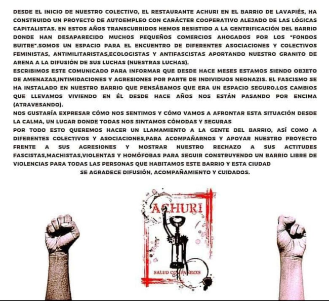 En los últimos meses, su claro posicionamiento político lo ha llevado a ser blanco de «amenazas, intimidaciones y agresiones» por parte de individuos neonazis, según acaban de denunciar sus responsables a través de un comunicado -difundido rápidamente en las redes de colectivos sociales del barrio- en el que informan y solicitan apoyo a sus vecinos ante la situación que están viviendo, «para seguir construyendo un barrio libre de violencias para todas las personas que lo habitamos».