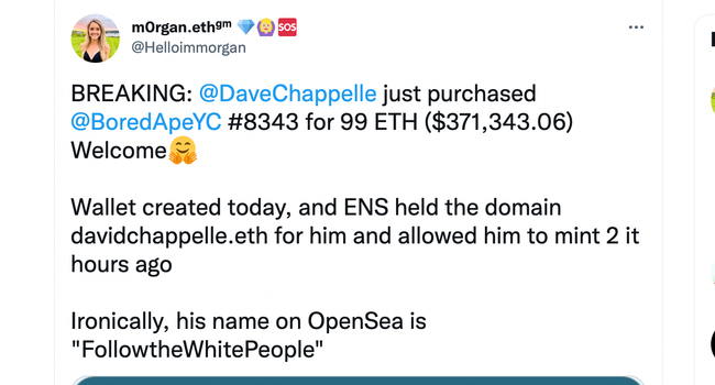 Somebody claiming to be Dave Chapelle now owns a bored ape