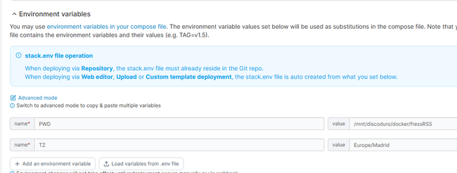 También he empezado a usar variables para definir ciertas cosas de mis stacks. Con portainer estas variables se dan valor de forma muy sencilla. Las variables en el stack se definen como ${VARIABLE} y luego abajo puedes asignar el valor (ver foto de como dar valor).