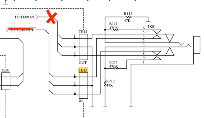 Cortamos el cable que va al conector *TE08 *y TE09. El cable del *TE08 *– *TE15 *hay que cortarlo dejando la suficiente distancia, desde el lado del TE15, como para poder manipularlo y conectarlo en la placa donde está el control de volumen, tono,… El cable del conector *TE14 *no lo utilizaremos, por lo que es conveniente tapar la punta con un poco de cinta aislante para que no pueda moverse y tocar lo que no debe.