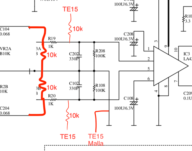 El cable que hemos cortado que sale del conector TE15, tendrá 3 puntas (L, R, GND). Una irá conectada a tierra, la del mallado. Las otras dos puntas, le añadiremos una resistencia de 10k y los conectaremos a donde indica el esquema.