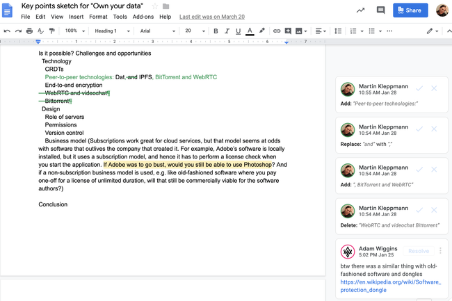 Different versions of a document can lead to confusion. As with a Git repository, what a particular user sees in the “master” branch is a function of the last time they communicated with other users. Newly arriving changes might unexpectedly modify parts of the document you are working on, but manually merging every change from every user is tedious. Decentralized documents enable users to be in control over their own data, but further study is needed to understand what this means in practical user-interface terms.