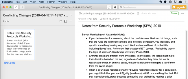 In Evernote, if a note is changed concurrently, it is moved to a “conflicting changes” notebook, and there is nothing to support the user in resolving the situation — not even a facility to compare the different versions of a note.