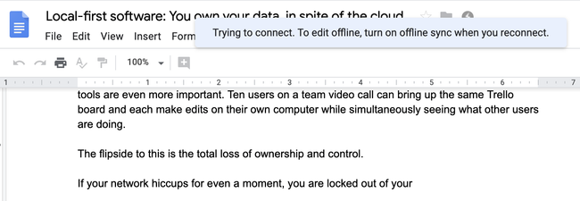 “Old-fashioned” apps work fine without an Internet connection, but cloud apps typically don’t work while offline. For several years the Offline First movement has been encouraging developers of web and mobile apps to improve offline support, but in practice it has been difficult to retrofit offline support to cloud apps, because tools and libraries designed for a server-centric model do not easily adapt to situations in which users make edits while offline.