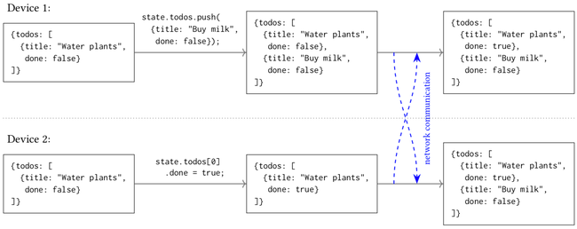 The FRP model of React fits well with CRDTs. A data layer based on CRDTs means the user’s document is simultaneously getting updates from the local user (e.g. as they type into a text document) but also from the network (as other users and other devices make changes to the document).