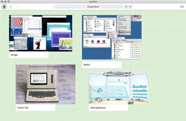 PushPin’s canvas mixes text, images, discussion threads, and web links. Users see each other via presence avatars in the toolbar, and navigate between their own documents using the URL bar.