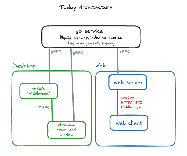 Key management and signing is owned by the frontend on web, but is owned by the daemon on desktop. This applies to all "writes" of p2p or permanent data