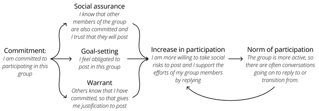 Figure 2.A description of commitment’s main effects. Committing assures participant of the intentions of other group members, sets an achievable participation goal for them, and provides a warrant for taking initiative in the conversation. Together, these factors lead to an increase in participation from group members, which over time creates a norm of participation which further encourages participation.