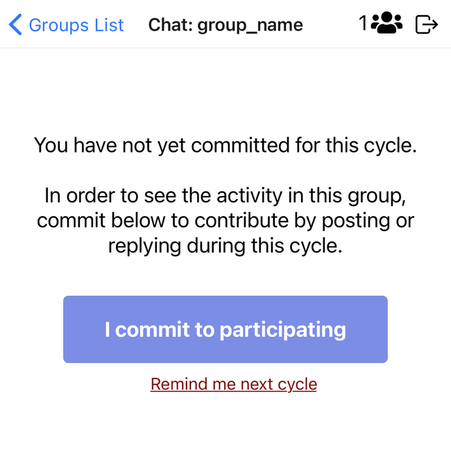 In response to these design guidelines, we designed a simple, recurring group commitment mechanism. Groups set particular expectations for participation on a periodic basis, for example posting once a week. In order to be in the group during a particular cycle and see the group content during that time, an individual is required to commit to participating during that cycle. The commitment cycle is synchronized across the group, starting and ending at the same time for every member to draw them into the group at the same time.