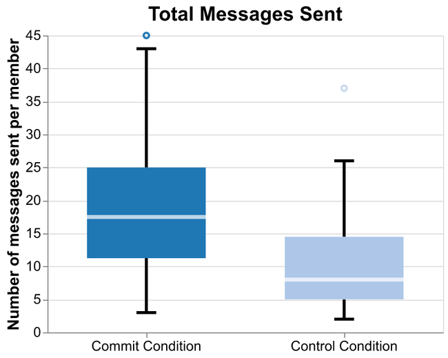 The impact of this small change is even clearer when we examine the data at the the time scale that participants were encouraged to participate at: two day periods. Both conditions encouraged participants to contribute to their groups at least once every two days, but only in the Commit condition did participants regularly meet this minimum. Participants in the Commit condition sent a median of one message per two-day period, while those in the control sent a median of zero. Between encouraging conversation initiation and swaying participants to reply more, commitment is very effective at drawing participants up to the level of expected participation that we set.