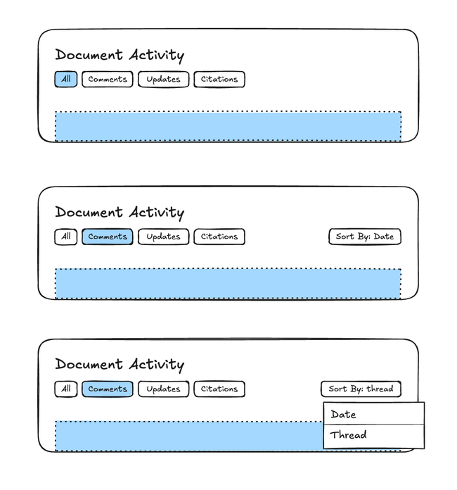 Based on Eric's comment, I realize that making the discussions a "sub-panel" knowing that is one of the most important ones sounds very silly tbh. so I had the idea of actually proposing the opposite: add the group by action to the current discussions panel and remove comments from the Document Activity. This will look like this: