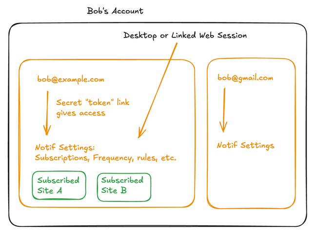 what happens if two accounts subscribe to the same email??!? maybe this is just allowed no big deal, as long as the email token link has full ability to unsubscribe and manage notifs that go there