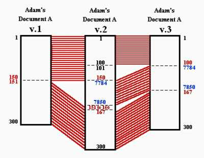 Suppose author Adam creates document A, version 1, which he publishes on line as the first document in this format. He publishes all 300 characters at once, causing these characters to be given consecutive universal addresses. The text contents of document A v.1 are therefore registered as having consecutive addresses from 1 to 300.