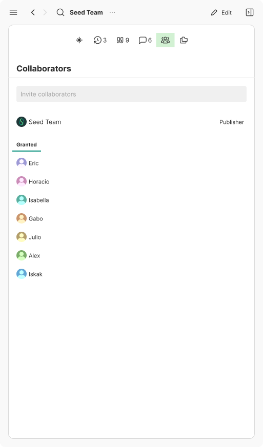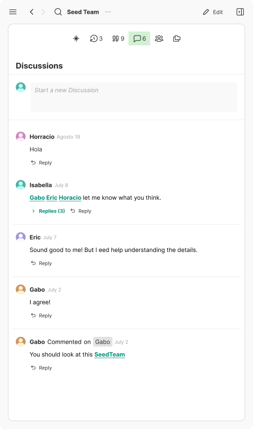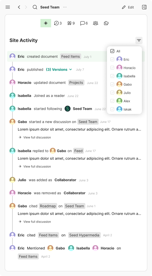 Document updates will represent the version history, citation on document will represent citations and comments and threaded blocks will represent discussions.