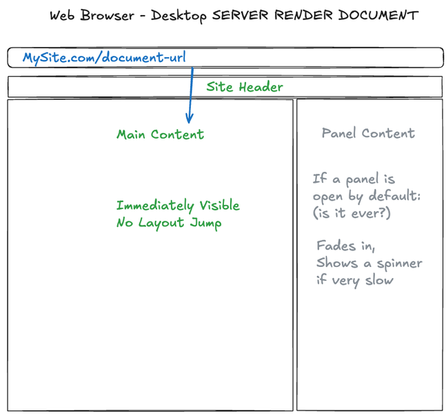 We will be more deliberate about when to use server rendering. This will help draw the user's attention to the content that is being addressed, and the other panel will come in a bit later- it will not be server rendered and will use an async request to load.