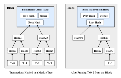 Once the latest transaction in a coin is buried under enough blocks, the spent transactions before it can be discarded to save disk space. To facilitate this without breaking the block's hash, transactions are hashed in a Merkle Tree [7][2][5], with only the root included in the block's hash. Old blocks can then be compacted by stubbing off branches of the tree. The interior hashes do not need to be stored.